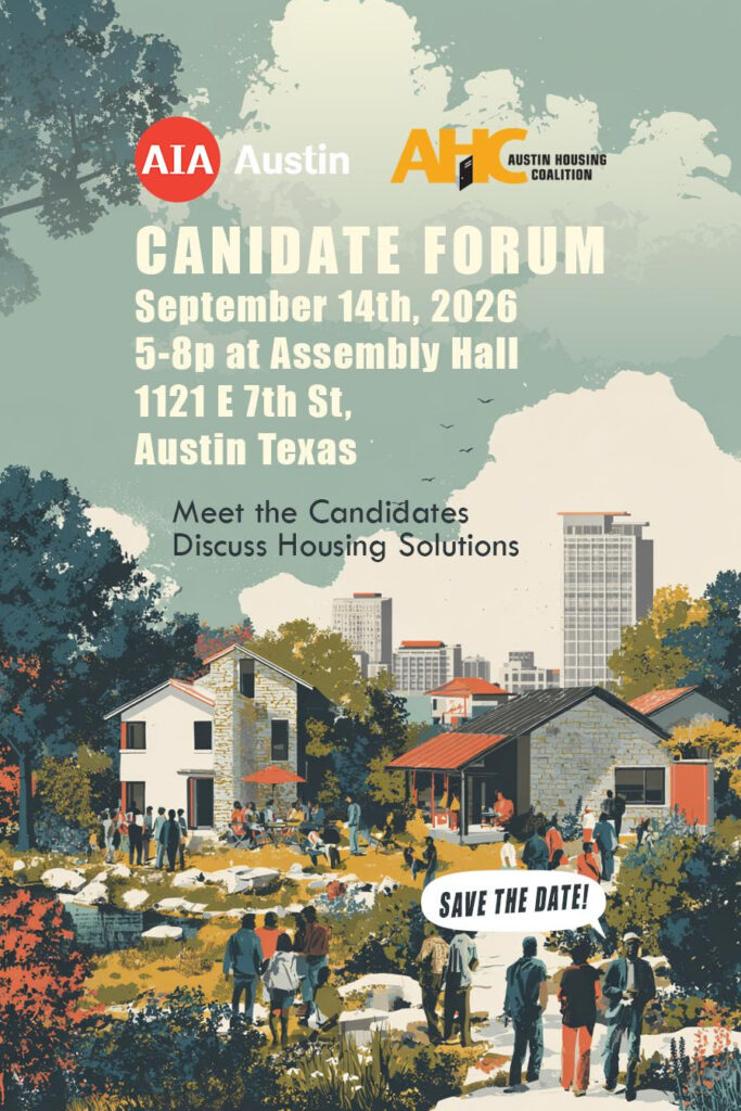 Save the Date! Candidates for the open City Council seats will share their positions on various issues related to housing affordability, planning, and development. Presented by AIA Austin Advocacy and Austin Housing Coalition. Details and registration coming soon.