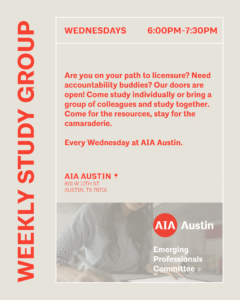 Are you on your path to licensure? Do you need accountability buddies? Our doors are open! Come study individually or bring a group of colleagues and study together. Come for the resources, stay for the camaraderie. The AIA Austin office at 801 W 12th street hosts a study group on Wednesdays from 6pm – 7:30pm to study for the ARE 5.0 exams. Our study group also communicates via Discord. Please email brianna_deleon@gensler.com and cc aia.austin.ep@gmail.com for questions and inquiries.