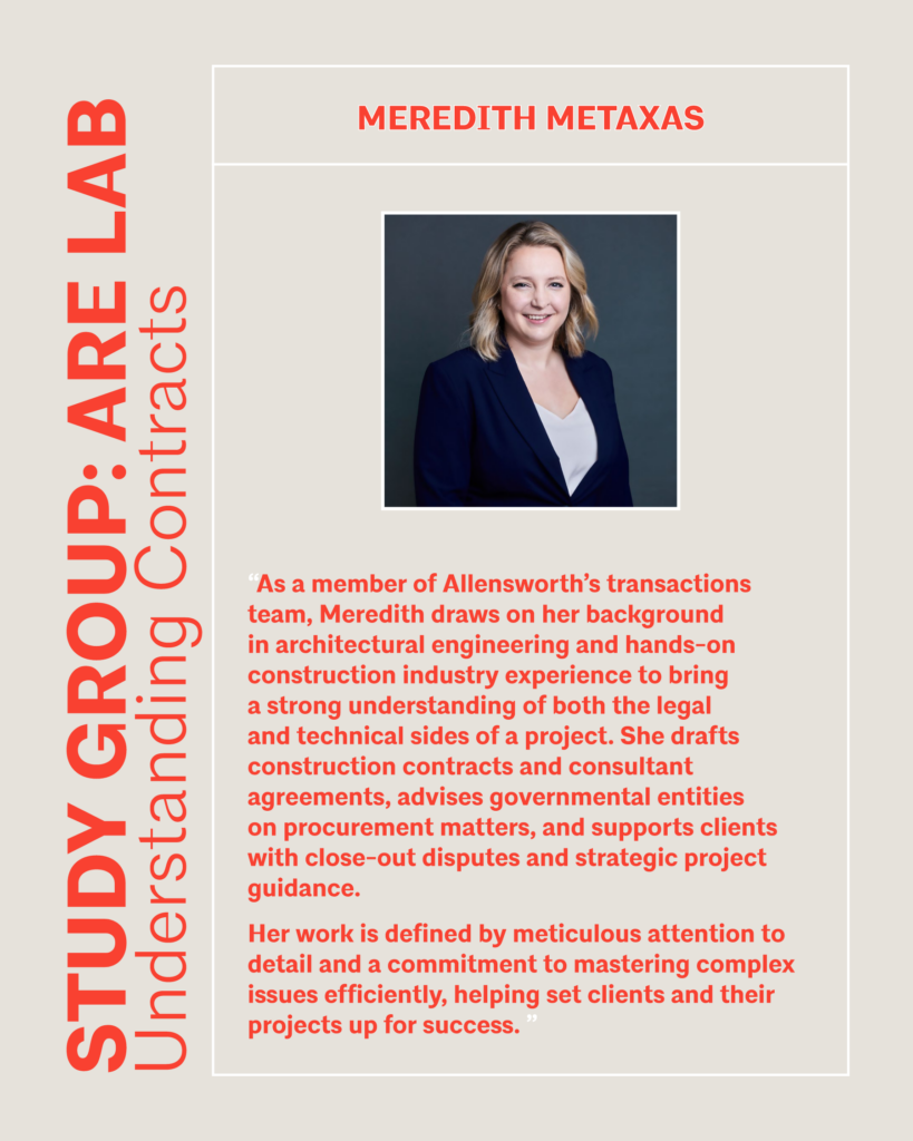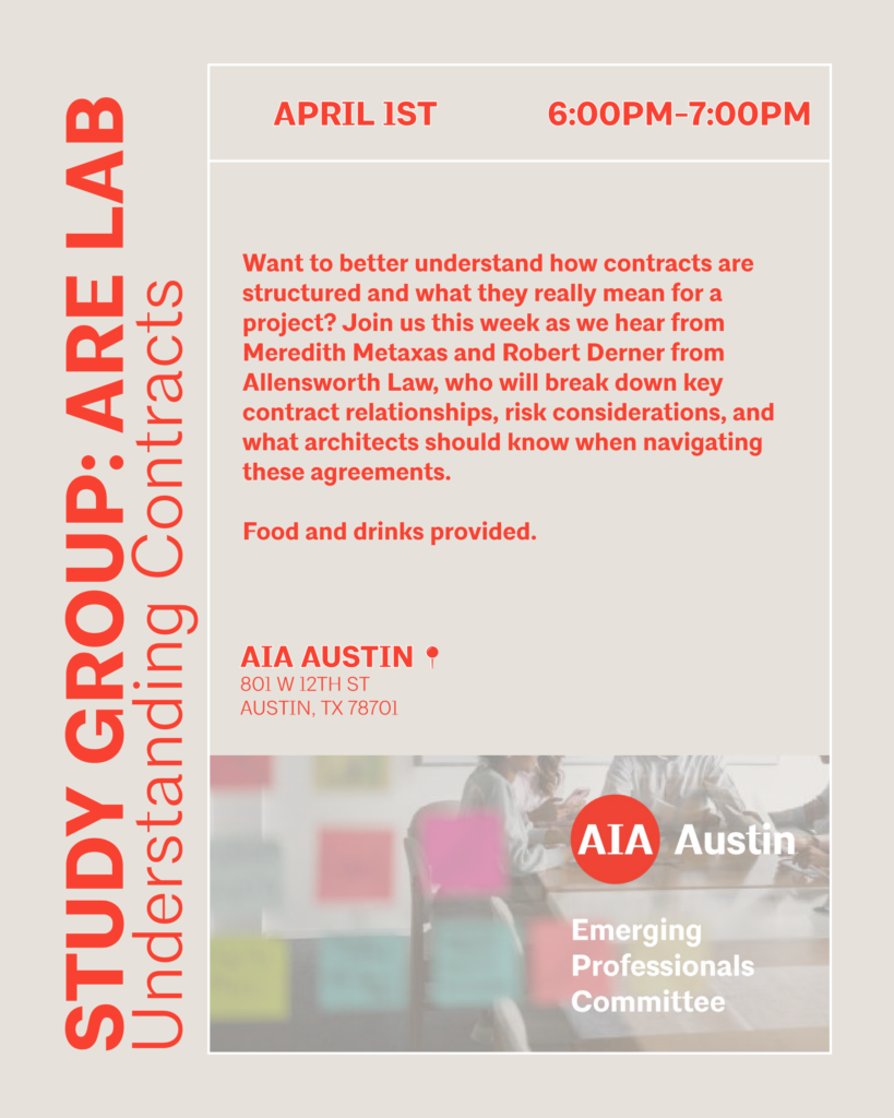 Once every other month the study group will have either a guest speaker or a guided work through an exam question. Want to better understand how contracts are structured and what they really mean for a project? Join us April 1 as we hear from Meredith Metaxas and Robert Derner from Allensworth Law, who will break down key contract relationships, risk considerations, and what architects should know when navigating these agreements. Food and drinks provided.