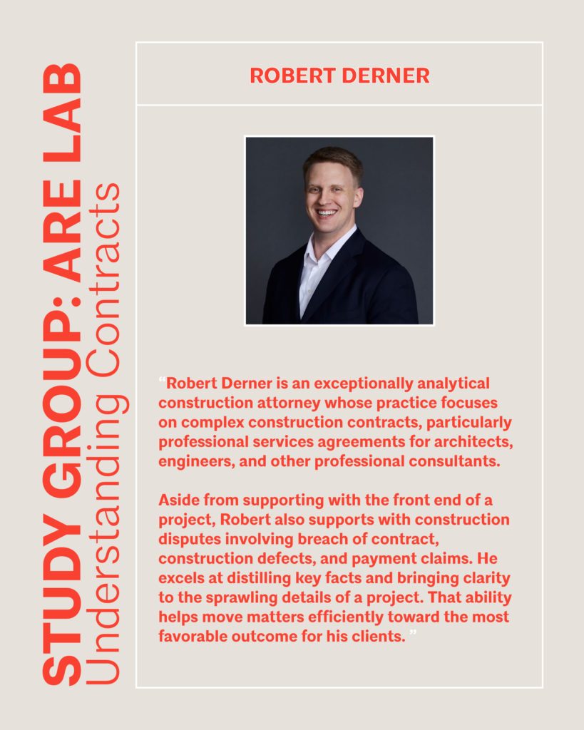 Robert Derner is an exceptionally analytical construction attorney whose practice focuses on complex construction contracts, particularly professional services agreements for architects, engineers, and other professional consultants. Aside from supporting with the front end of a project, Robert also supports with construction disputes involving breach of contract, construction defects, and payment claims. He excels at distilling key facts and bringing clarity to the sprawling details of a project. That ability helps move matters efficiently toward the most favorable outcome for his clients.
