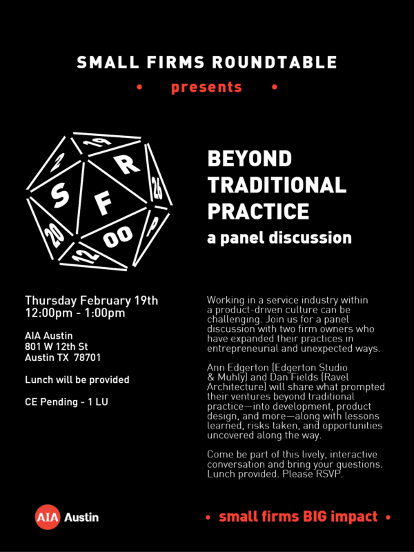 Working in a service industry within a product-driven culture can be challenging. Join us for a panel discussion with two firm owners who have expanded their practices in entrepreneurial and unexpected ways. Ann Edgerton (Edgerton Studio & Muhly) and Dan Fields (Ravel Architecture) will share what prompted their ventures beyond traditional practice—into development, product design, and more—along with lessons learned, risks taken, and opportunities uncovered along the way. Come be part of this lively, interactive conversation and bring your questions. Lunch provided.