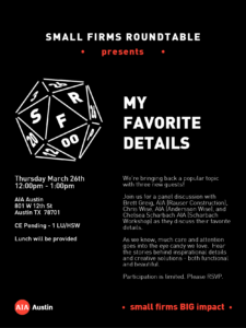 We’re bringing back a popular topic with three new guests! Join us for a panel discussion with Brett Greig, AIA (Rauser Construction), Chris Wise, AIA (Andersson Wise), and Chelsea Scharbach AIA (Scharbach Workshop) as they discuss their favorite details. As we know, much care and attention goes into the eye candy we love. Hear the stories behind inspirational details and creative solutions – both functional and beautiful. Space is limited. Please RSVP>>