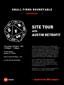Join the AIA Austin Small Firms Roundtable for a site tour of a landmark home in SOCO and explore its ambitious custom-fabricated fenestration. We’ll hear from Murray Legge Architecture, Level on the Level, and Austin Retrofit discussing the design considerations associated with installing the home’s impressive Reynaers window system.