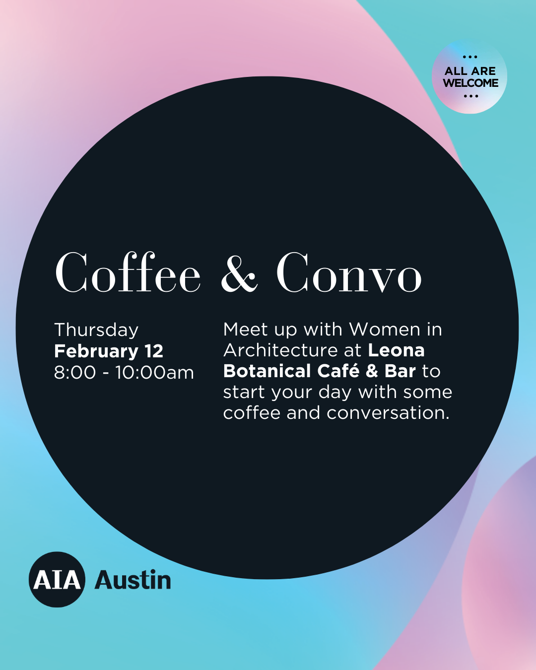 Join the Women in Architecture group for their monthly meetings on the third Friday of each month. All meetings will be virtual via Zoom unless otherwise noted. Sign up for our mailing list here to receive the Zoom invite. Learn more about WiA >>> 2026 Chair: Danielle Smith, AIA 2026 Chair-Elect: Tooba Jalal, Assoc. AIA AIA Austin staff … Continued